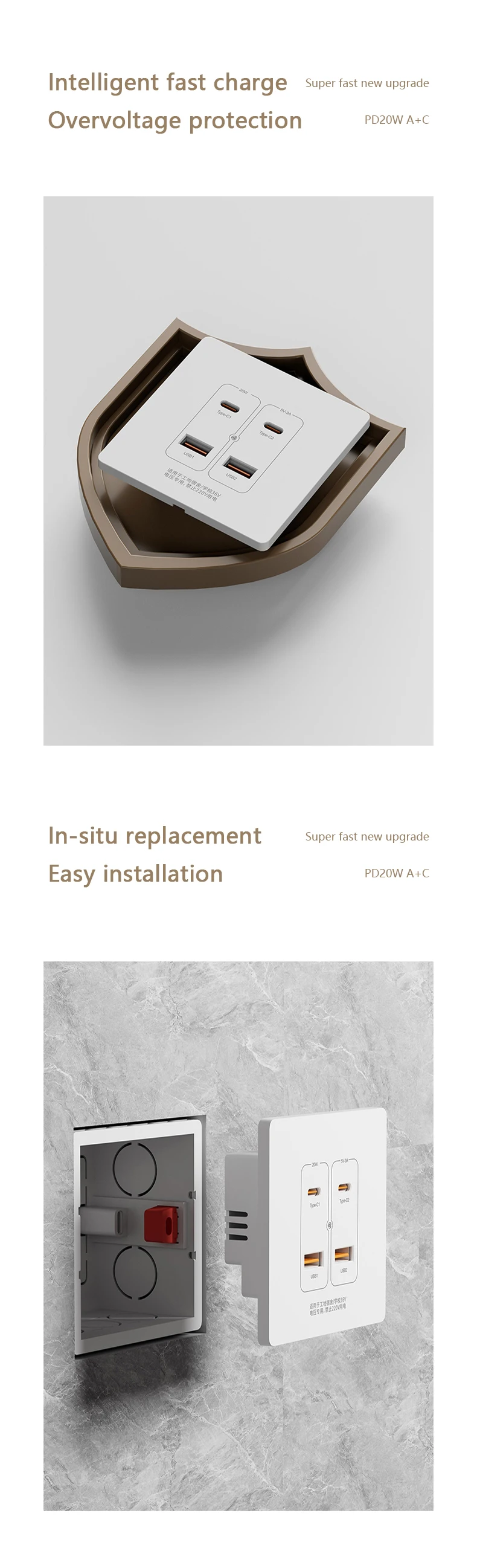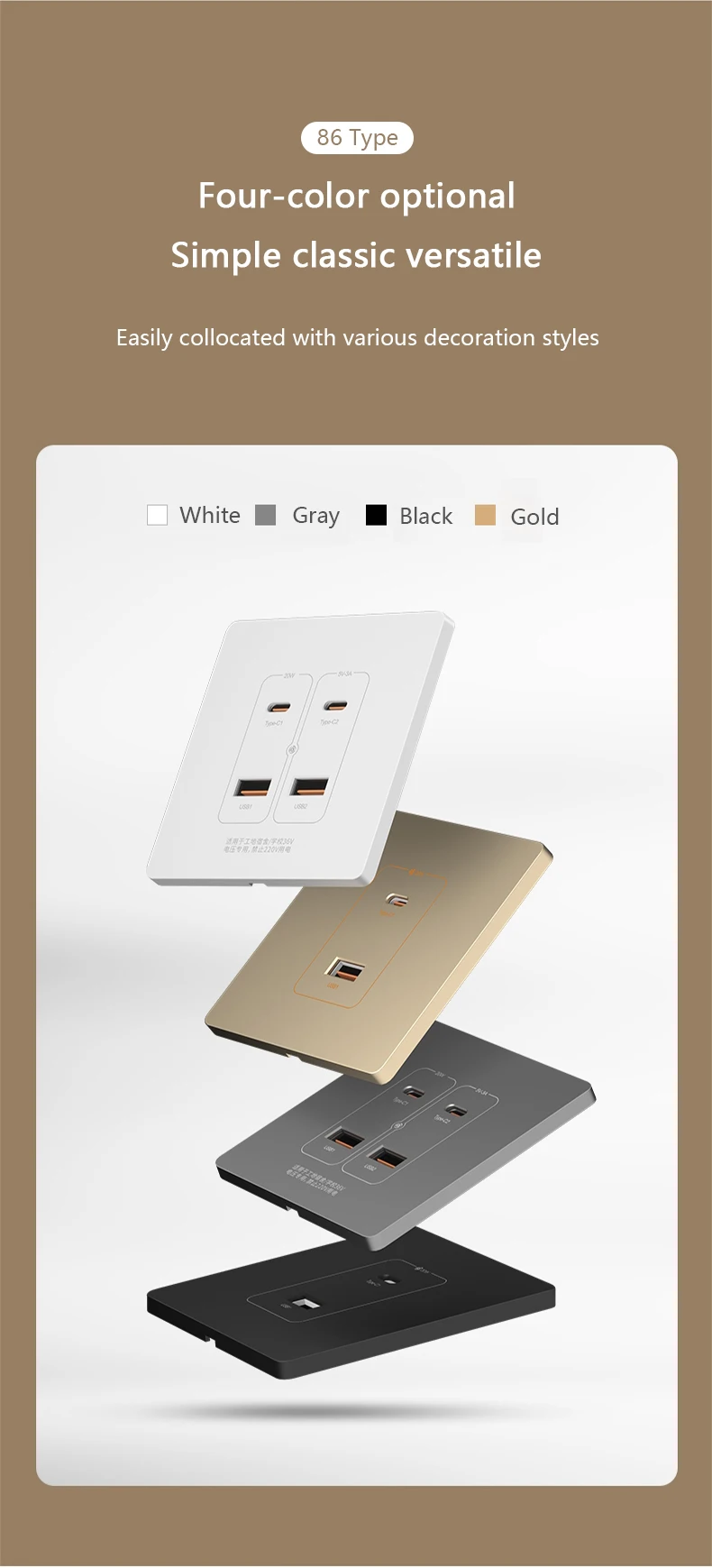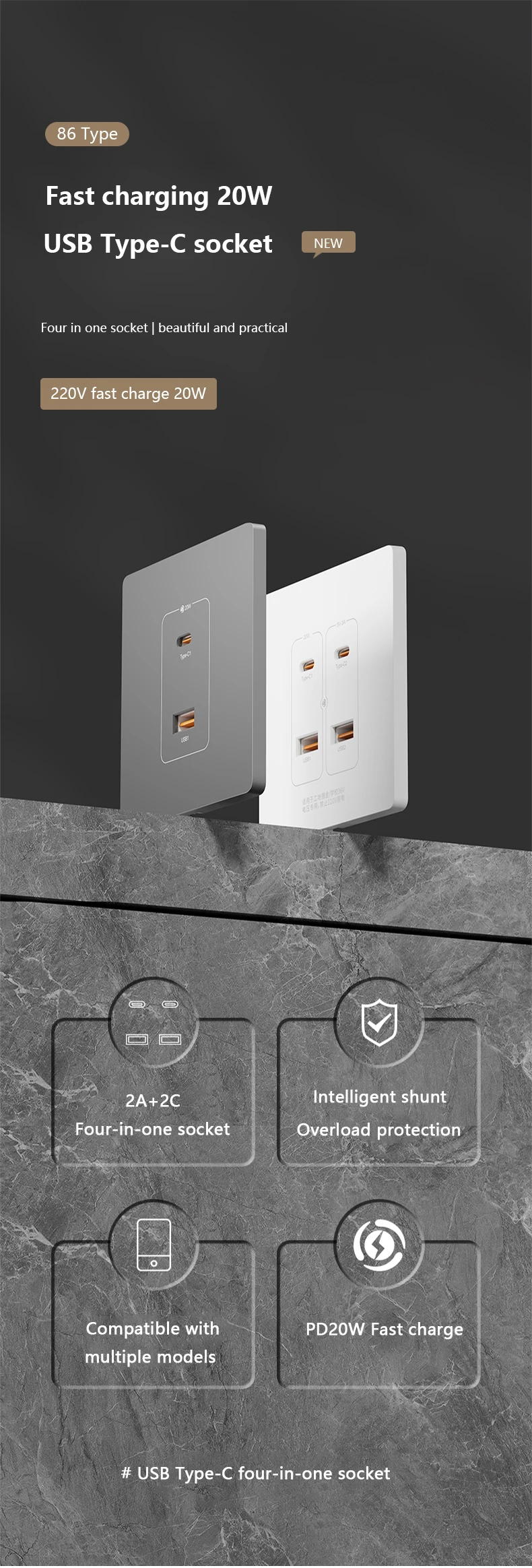 86 size PC Panel Universa Standard Wall Power Socket Dual USB Type-c PD 3.0 20W Fast Charging