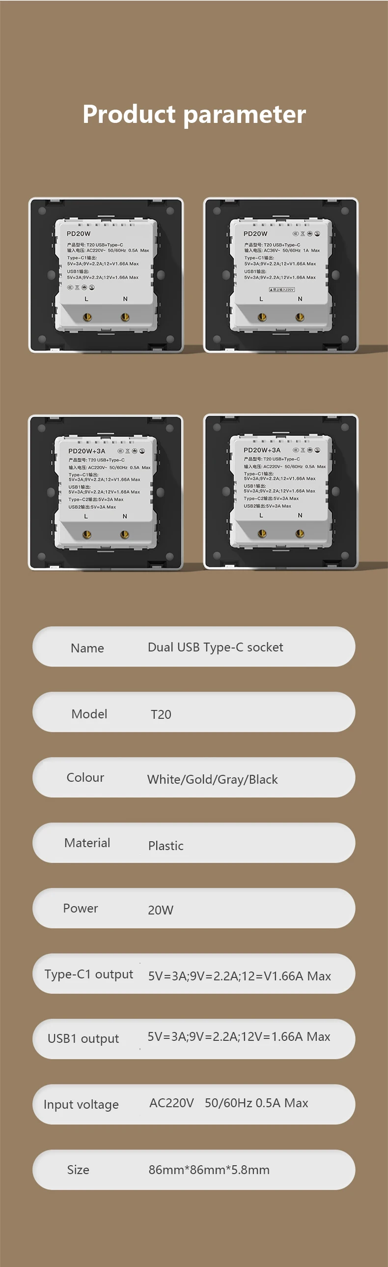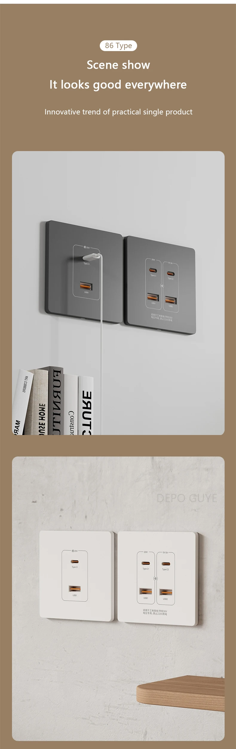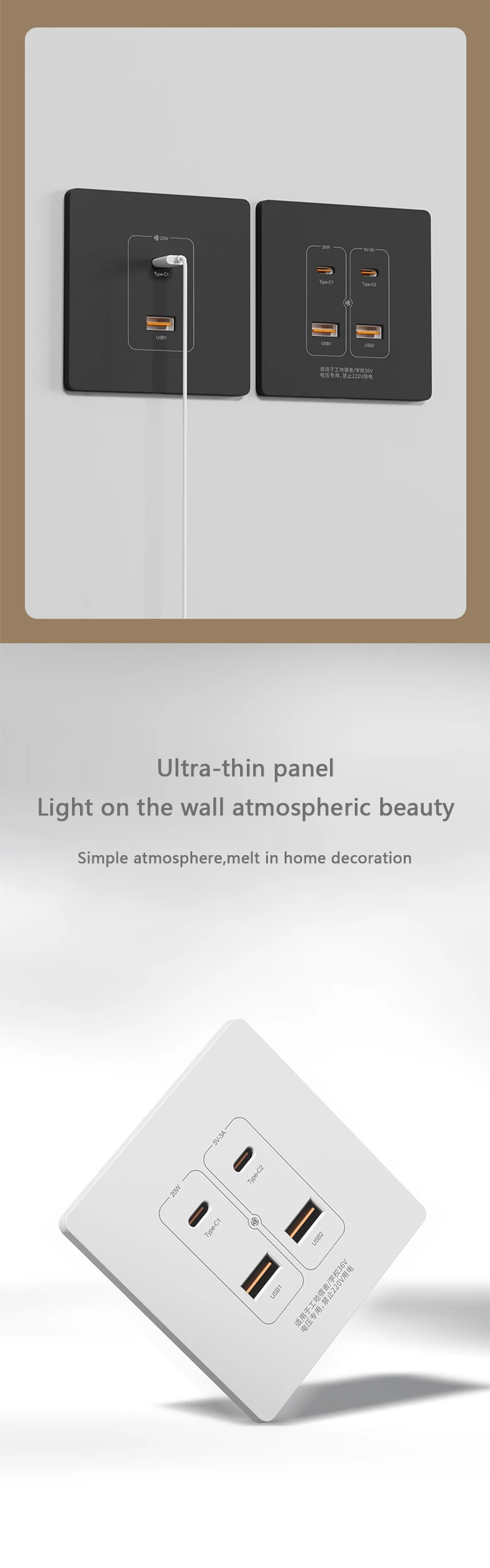 86 size PC Panel Universa Standard Wall Power Socket Dual USB Type-c PD 3.0 20W Fast Charging