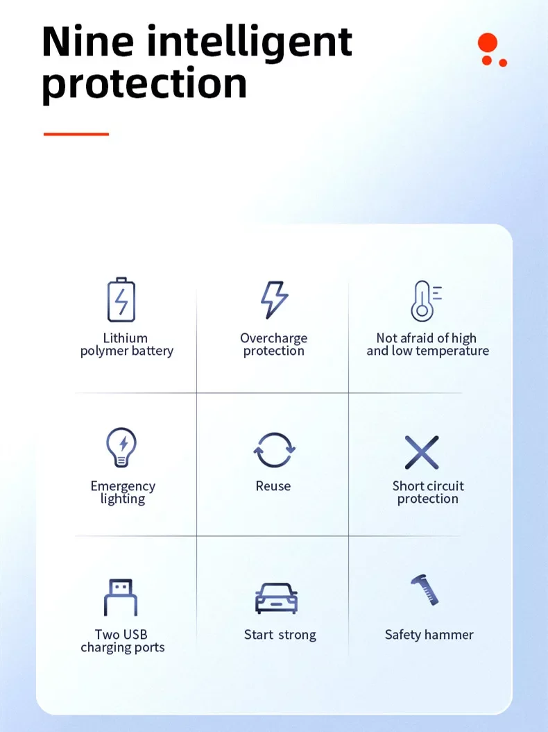 Function: With LED Light,Spark Proof,Digital screen,Jump Start Vehicles,DC output,Tire Inflator,USB output