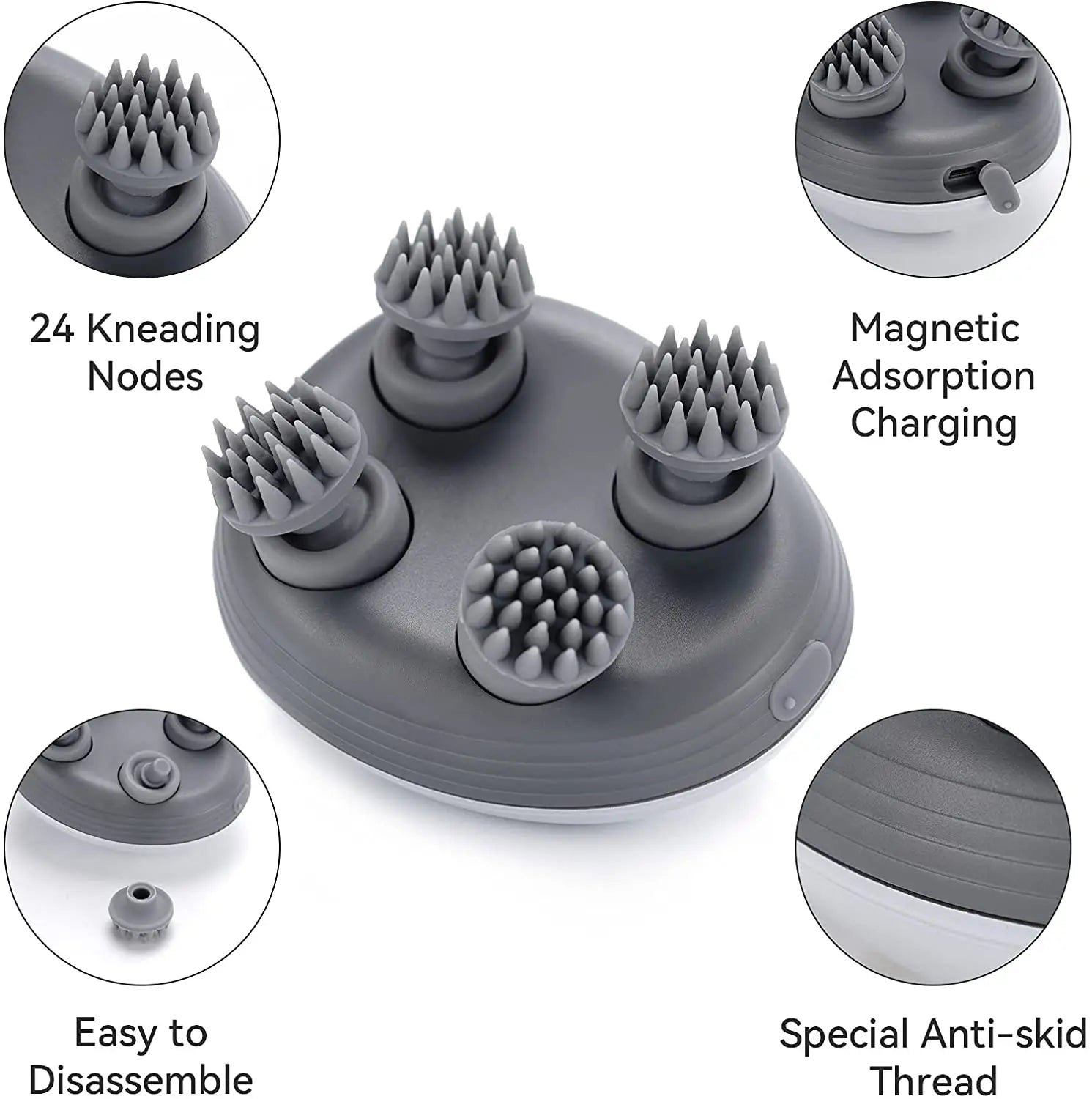 1. Deep scalp and stress relieving massage: Scalp massager features 4 massage heads with 24 individual nodes and 3D Deep-Kneading,perfectly fits the scalp and provides a gently kneading 360°massage experience.